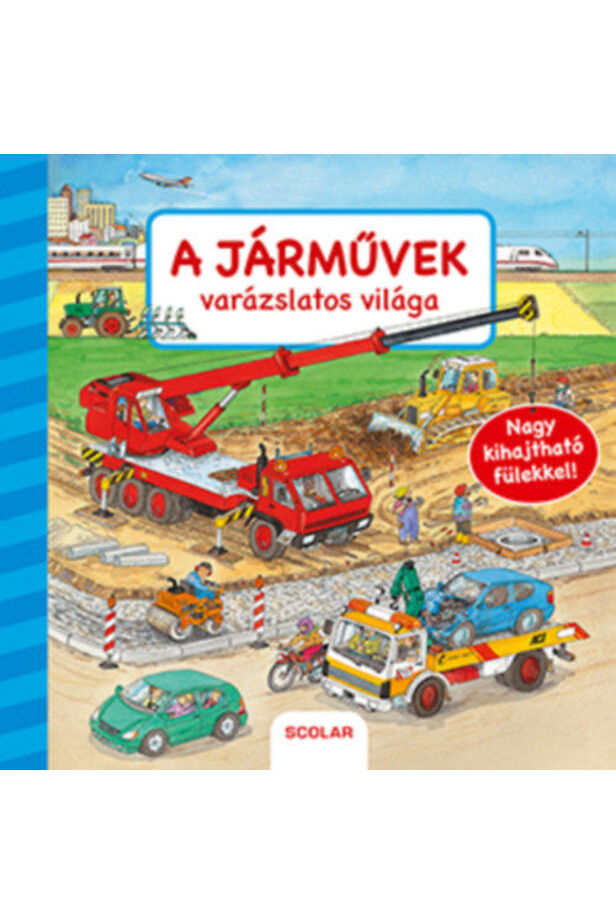 "A járművek világában rengeteg a felfedeznivaló! Nézz körül a gazdaságban, az építkezésen, a tűzoltóságon, az autószerelő műhelyben és a Forma-1-es versenyen! Mennyi érdekes jármű! A nagy kihajtható fülek megannyi meglepetést tartogatnak!"