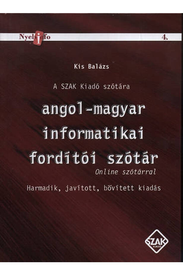 A SZAK Kiadó szótára a kiadó könyvfordítási tevékenysége során alkalmazott terminológiából, a SZAK Kiadó több mint 50 kiadványának szójegyzékeiből készült. Igazi fordítói szótár: a szövegekben szereplő informatikai szakkifejezésekre adott fordítói megoldásokat közli. Az első kiadás óta több mint kétszeresére növekedett a szótár. Közel 27 000 szócikkével a szakterületen kimondottan nagynak tekinthető. A kötet anyaga a weben is elérhető. A szótárt legfőképpen fordítóknak ajánljuk, de jól használhatják mindazok a gyakorló informatikusok, tanulók, érdeklődők is, akik angol nyelven olvasnak informatikai szakirodalmat. Figyelem: A szótárban nincsenek benne azok a szavak és kifejezések, amelyek a fent említett több mint 50 kiadványban nem fordultak elő. Ezért az Olvasó a szótár weblapján kiegészítéseket is javasolhat a későbbi kiadásokhoz.