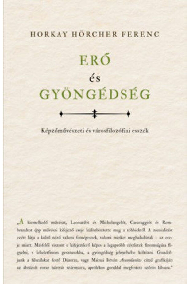 Horkay Hörcher Ferenc Erő és gyöngédség című könyve képekről és városokról szól. A képek - jobbára - kétdimenziós ábrázolások, a városok - szükségszerűen - háromdimenziós tárgyak. A városokat ábrázoló kétdimenziós képek: városképek. De mi köti össze a kötet esszéiben olvasható képleírásokat, "írott képeket" a városfilozófiai szövegekkel? A leírás "mestersége". A válogatott tanulmányok tétje ugyanis az, hogy mi adható át ezekről a festményekről és a kiválasztott városokról a természetes nyelv közvetítésével,ráadásul írásban.