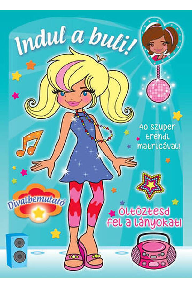 Our four models: the blonde Lili, the brown Hanna, the red Noémi and the black-haired Jasmine are extremely creative: they design and present a lot of inspiring clothing models for every occasion. From page to page, we can learn about the models ’tastes, opinions about dressing, the world of fashion, and why they love their work so much. With the help of beautiful, glossy stickers, everyone can try on dressing up the models! The party is starting! In our volume, they offer us light, loose, yet individual clothes and accessories for dancing and parties. Stick with them and help them dress up!