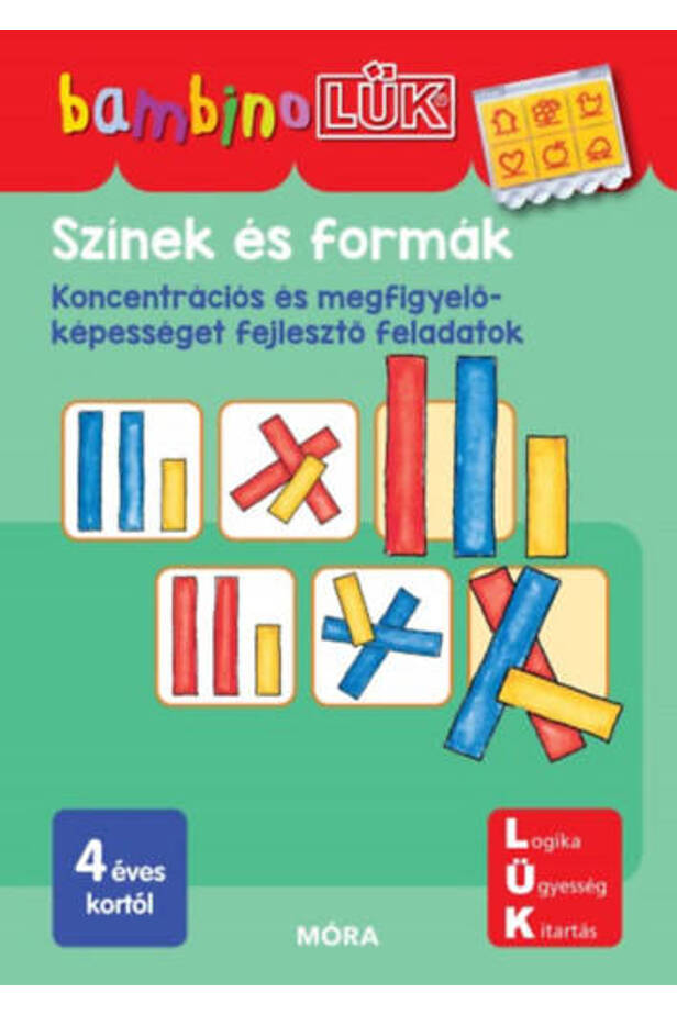 A Bambino LÜK- Színek és formák 24 oldalas füzet feladatai végzése közben kiderül képes-e a gyermek tárgyakat vizuálisan sorba rendezni, különbözőségeket észrevenni és megnevezni, vagy a különböző képeken a hiányzó részleteket felfedezni és kiegészíteni. Ezek a képességek alapvető fontosságúak egy sikeres iskolakezdéshez.